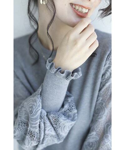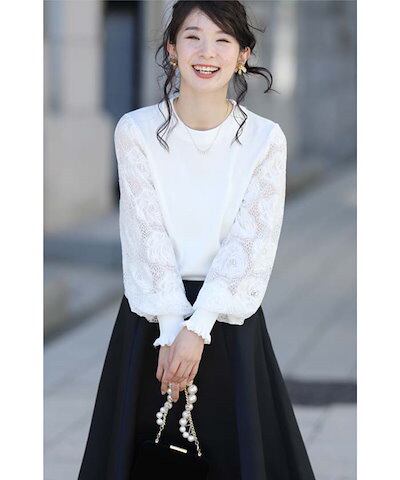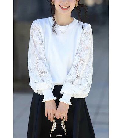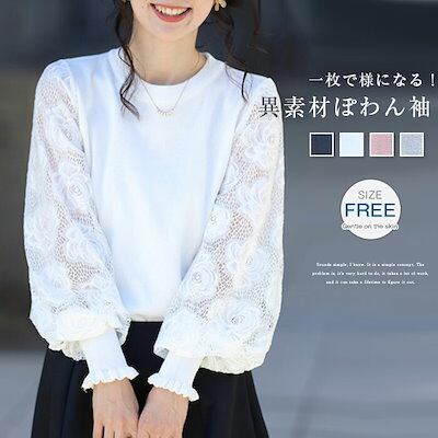 カットソー ニット レディース 初秋 レース 切り替え トップス パフ袖 カットソー ベーシック レース袖 透け感袖 長袖 リブ 柔らかい 着痩せ 女性らしい 大人 春 秋 長袖 通勤 普段着 カジュ