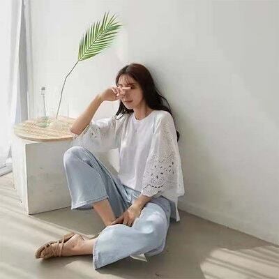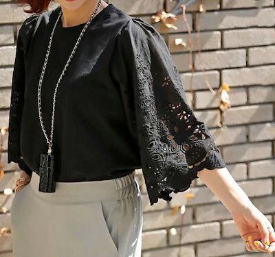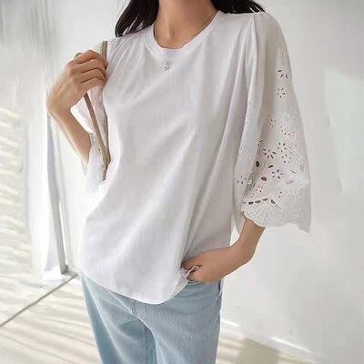 Tシャツ レディース ブラウス レース切り替え 花柄 刺? 半袖 春 夏 秋 カットワーク フリル袖 トップス シャツ ホワイト フェミニン 着回し シンプル おしゃれ 大人 カジュアル こなれ感 ゆ