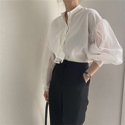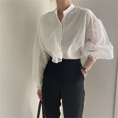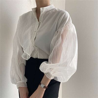 シャツ レディース 長袖 レース とろみ シャツ 透け感 春 夏 秋 レース切り替え ボリューム袖 トップス フェミニン 着回し シンプル おしゃれ 大人 カジュアル こなれ感 春 夏 大きいサイズ