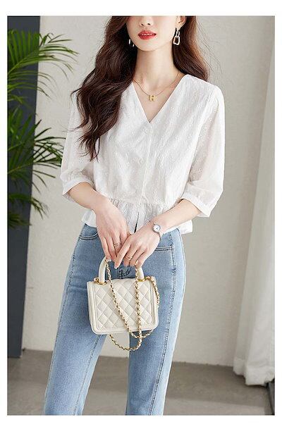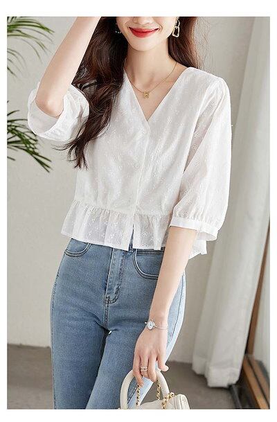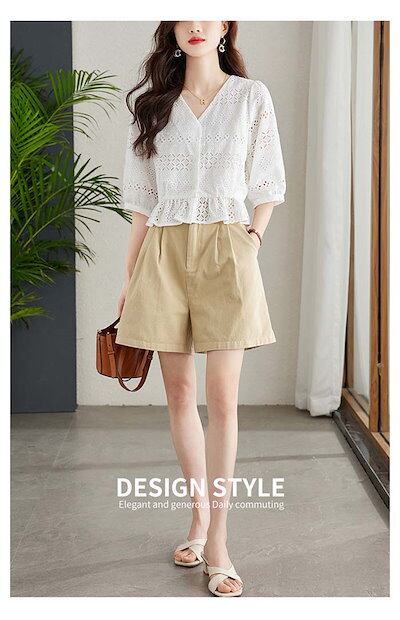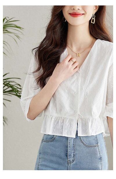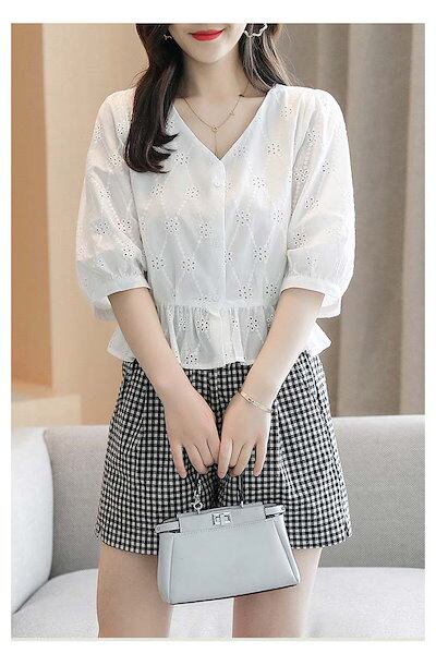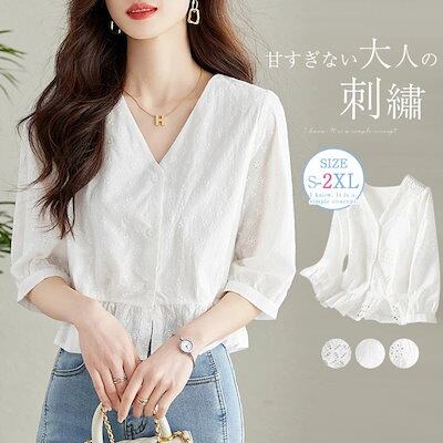 ブラウス レディース 5分袖 Vネック カットワーク レース 刺? 花柄 とろみトップス 春 夏 秋 ボリューム袖 透かし彫り トップス フェミニン 着回し シンプル おしゃれ 大人 カジュアル 大き