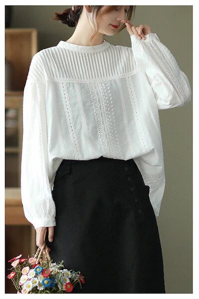 ブラウス レディース 長袖 刺? 花柄 透かし雕り とろみトップス コットン 綿 レース切り替え 春 夏 秋 トップス フェミニン 着回し シンプル おしゃれ 大人 カジュアル こなれ感 体型カバー