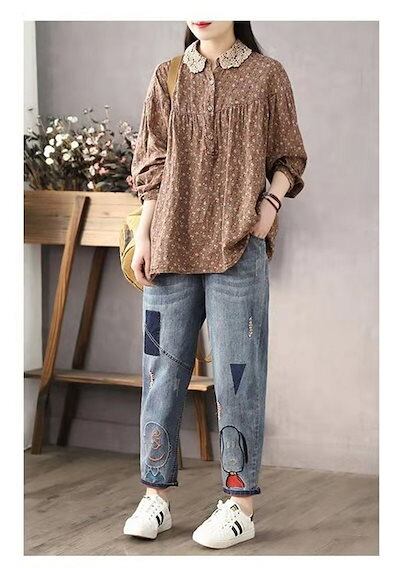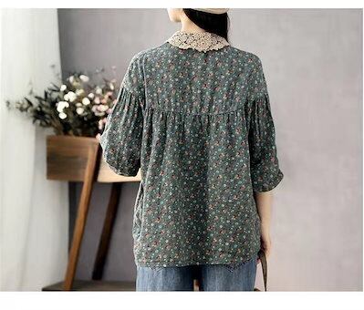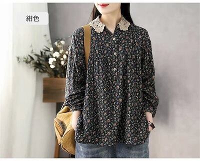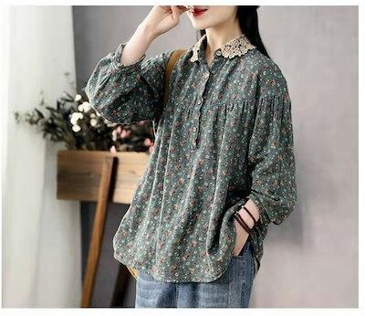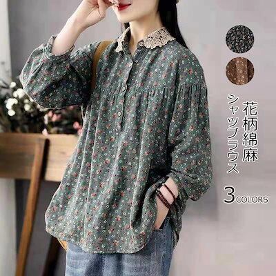 チュニック 綿麻 花柄シャツ レディース シャツ ブラウス リネンシャツ 長袖 シャツブラウス トップス 総柄 レース 襟付き アウター 秋物 長袖シャツ プルオーバー コットンリネン 通気性 大きい