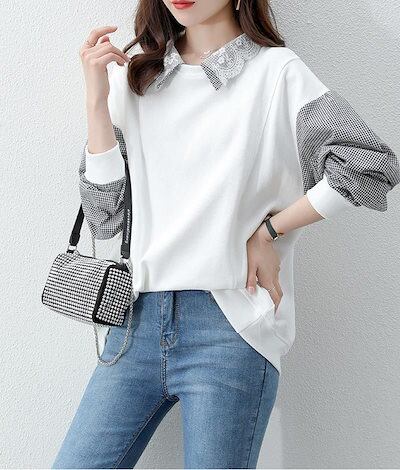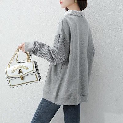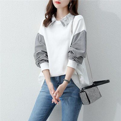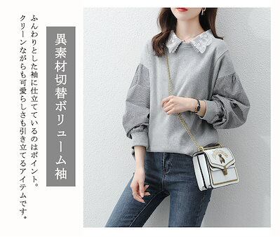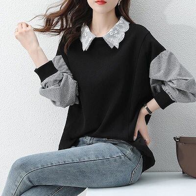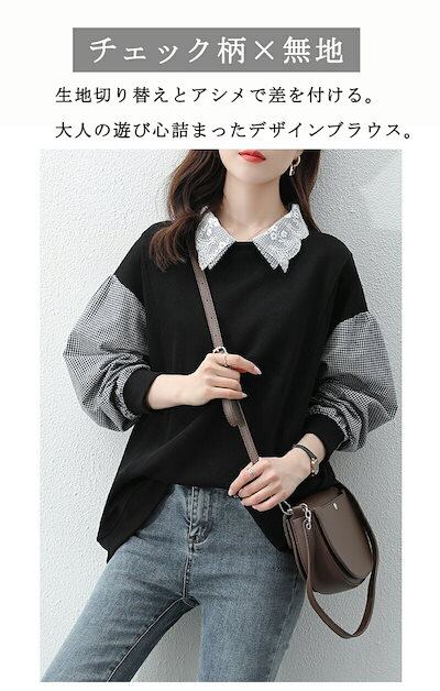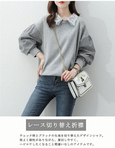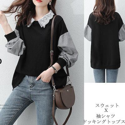 チュニック 長袖 ブラウス レディース トップス レース プルオーバー シャツブラウス 切り替え 異素材 ドッキング ブラウス ボリューム袖 チェック柄 シャツ スウェット 春 夏 秋 無地 切替