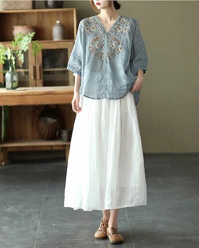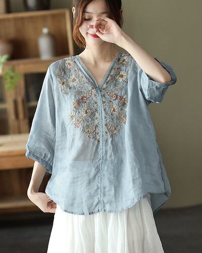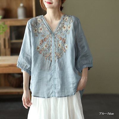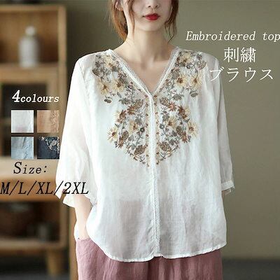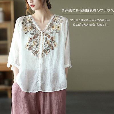 ブラウス レース 刺繍 半袖 Tシャツ 夏 刺繍ブラウス リネンシャツ 麻 トップス チュニック レディース 半袖シャツ tシャツ シャツブラウス vネック 綿シャツ 無地 花柄 刺繍シャツ 5分袖