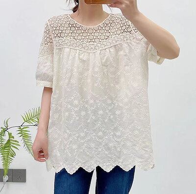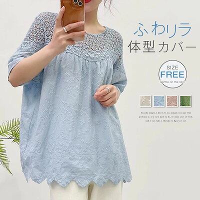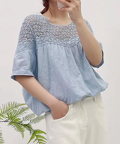 デザイン カットソー レディース 春夏 Tシャツ 綿 トップス 半袖 チュニック ブラウス コットン ロングTシャツ 長袖 ぽわん袖 ゆったり レース 無地 透け感 透かし編み 刺繍 切り替え