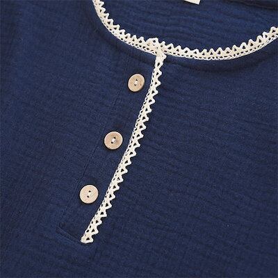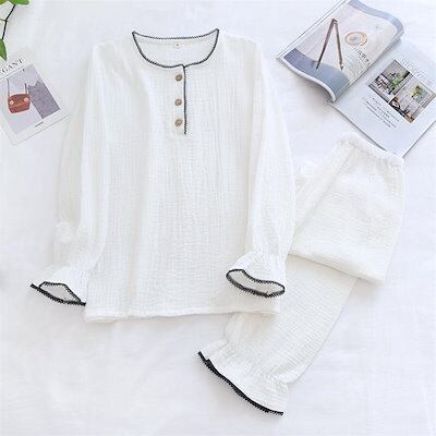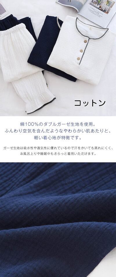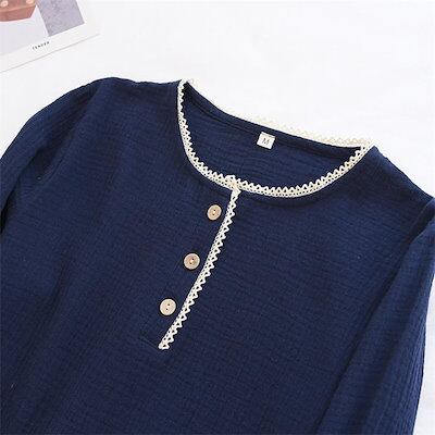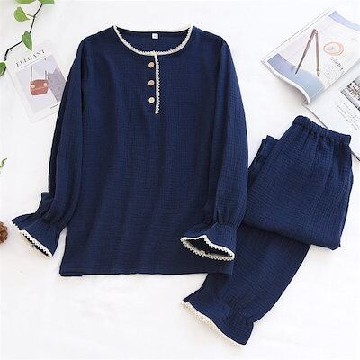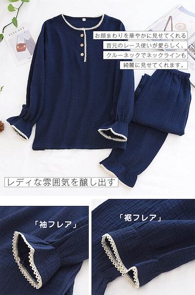 ダブルガーゼ パジャマ レディース ガーゼ ルームウェア 長袖 フレア袖 クルーネック レース トップス プルオーバー ロングパンツ 部屋着 セットアップ 2点セット 無地 寝巻き 女性 上下セット