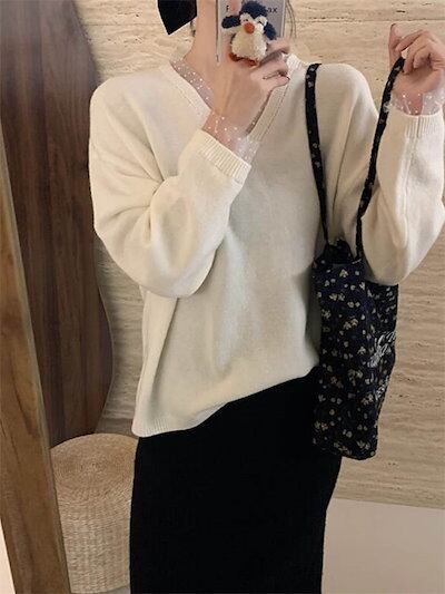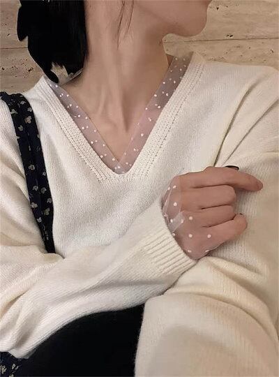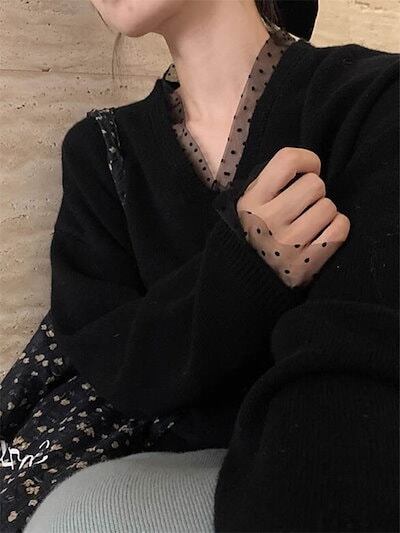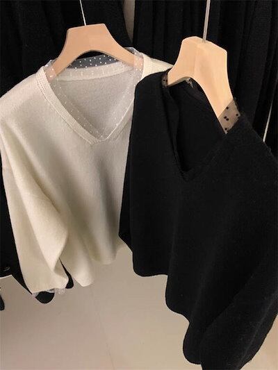 異素材 ニット セーター レディース 長袖 春 秋 冬 可愛い ドット 水玉 レース 切り替え ニットセーター おしゃれ チュール 秋冬 プルオーバー オフィス トップス ゆったり リラックス シンプ