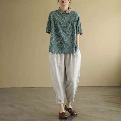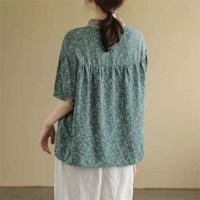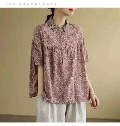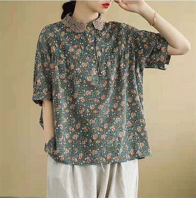 レース襟ブラウス レディース 春夏 ブラウス 半袖 夏 綿麻風 ブラウス トップス プルオーバー コットン 総柄 花柄 ナチュラル 森ガール Tシャツ キレイめ 大きいサイズ ゆったり 体型カバー 春