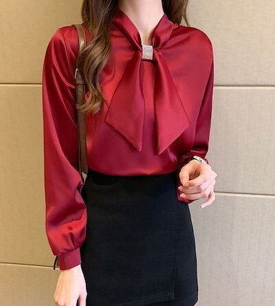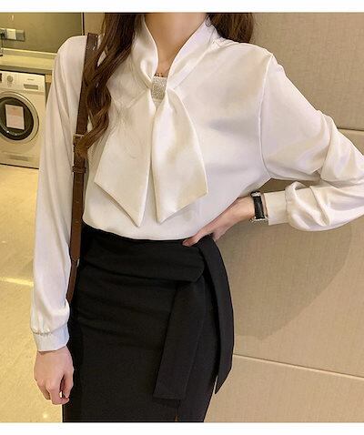 ブラウス フリル スカーフタイブラウス シャツ 長袖 バルーン袖 ボウタイ レディース トップス シャツブラウス 春 夏 秋 tシャツ ブラウス スタンドカラー フリルネック フォーマル 無地 大きい