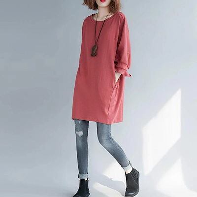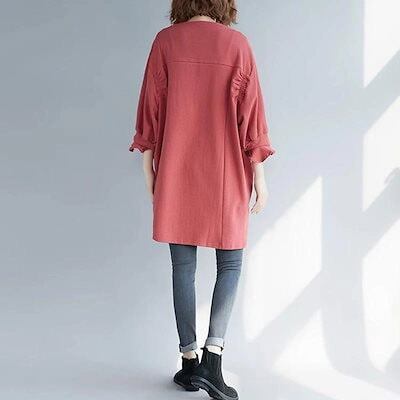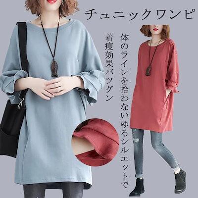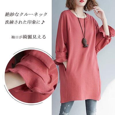 チュニック チュニックワンピース 袖口 フリル トップス プルオーバー ブラウス 綿 ワンピ 夏 クルーネック 膝上 レディース 春 夏 七分袖 無地 スウェット