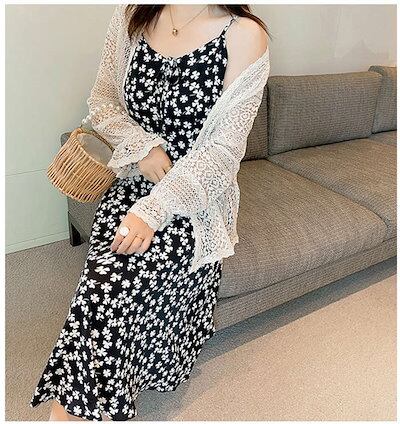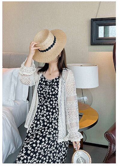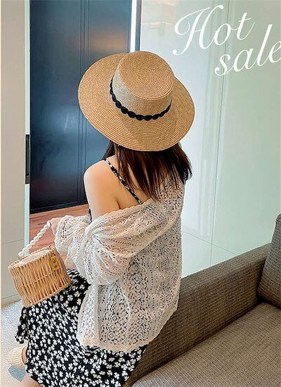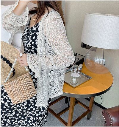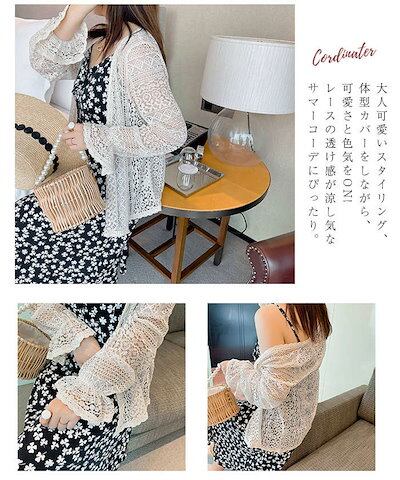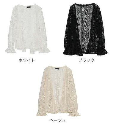 UVカット カーディガン レース 透かし編み 大きいサイズ レディース トップス 総レーストッパーカーディガン カーデ 羽織り トッパーカーディガン フリル袖 ポエットスリーブ 長袖 ニット 透け感