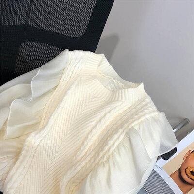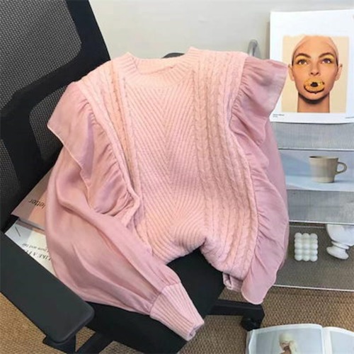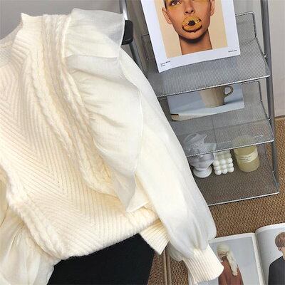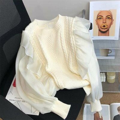 シフォン セーター レディース 長袖 秋冬 異素材 春 フリル リブニット 無地 リブ ニットセーター おしゃれ プルオーバー オフィス トップス ゆったり リラックス 大きいサイズ カジュアル 柔