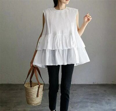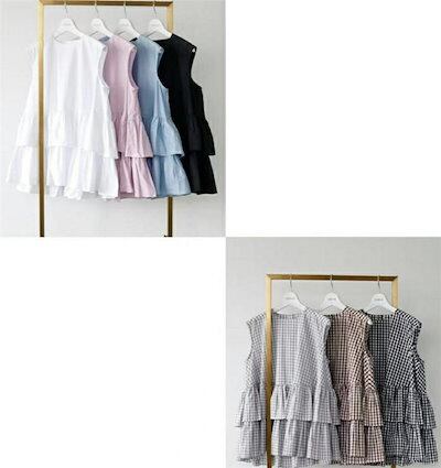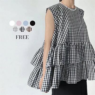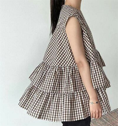 ギンガムブラウス トップス レディース 春 夏 ティアード ブラウス ノースリーブ tシャツ カットソー チュニック カジュアル 可愛い お洒落 春夏 前後差 フリル aライン ラウンドネック 通勤