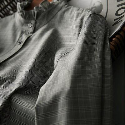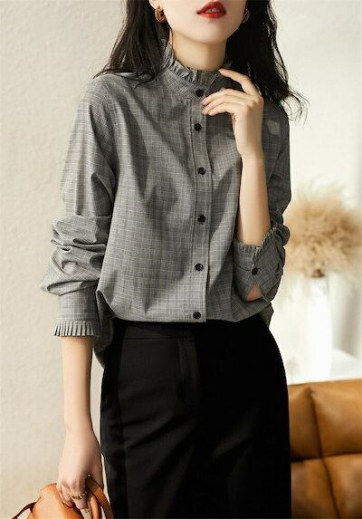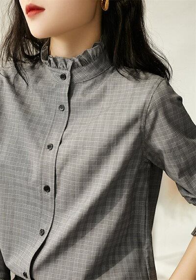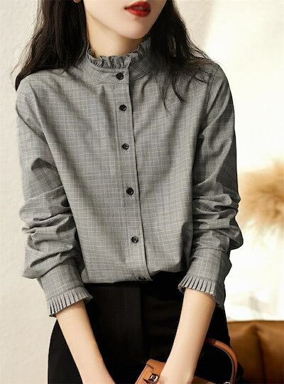 シャツ ブラウス レディース 春秋 シャツブラウス 長袖 長袖シャツ フリル チェック柄 立ち襟 フレア チュニック 前開き レイヤード 重ね着 通勤OL オフィス ベーシック カジュアル おしゃれ