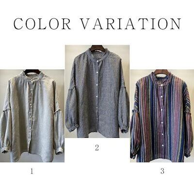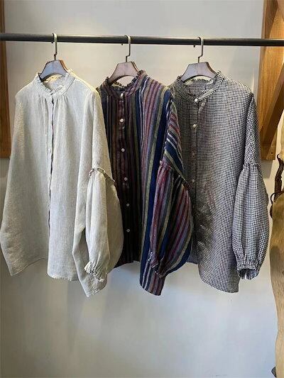 シャツ フリル襟 レディース 春秋 リネン 麻 リネンシャツ 麻 長袖 ブラウス シャツブラウス 無地 チェック ストライプ ナチュラル 前開き トップス ゆったり 体型カバー 着?せ 森ガール 大人