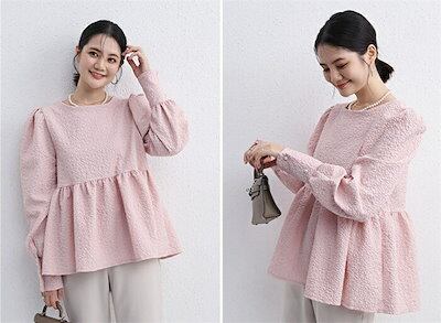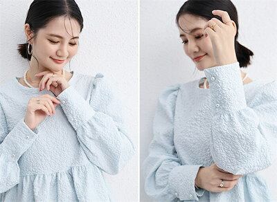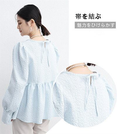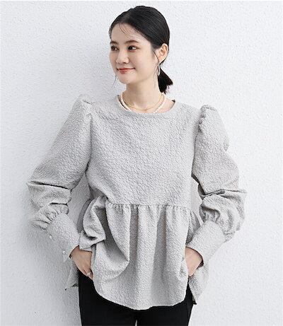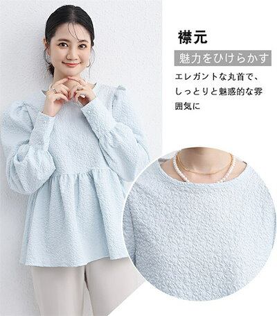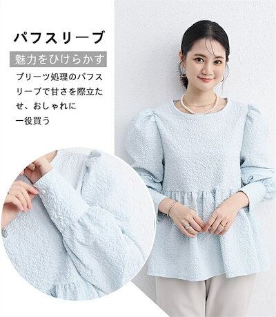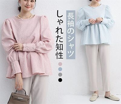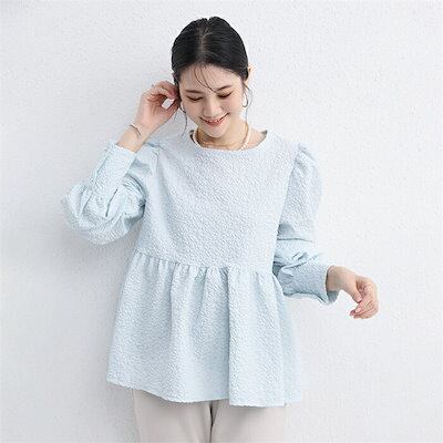シャツ ブラウス レディース 春秋 シャツブラウス 長袖 パフ袖 フレア フリル裾 クルーネック トップス ギャザー 無地 可愛い ゆったり 体型カバー 着?せ おしゃれ 大人可愛い ガーリー 森ガー