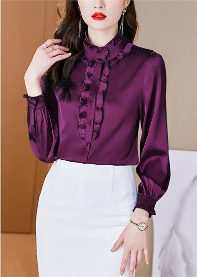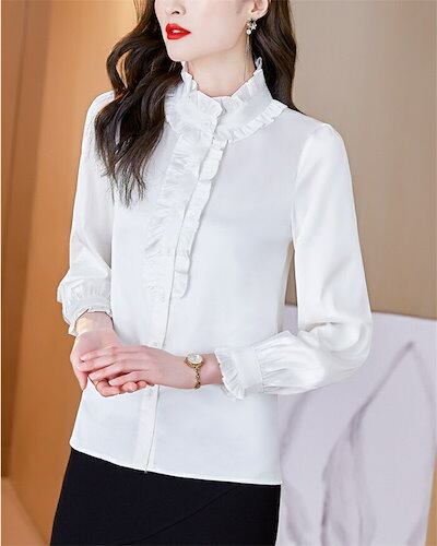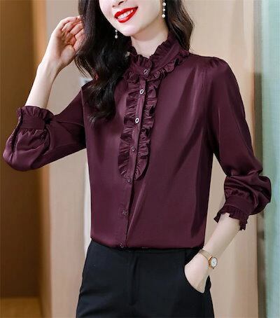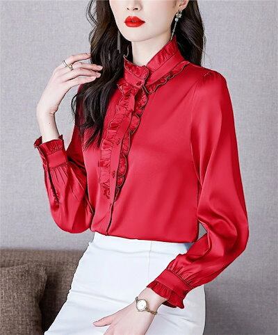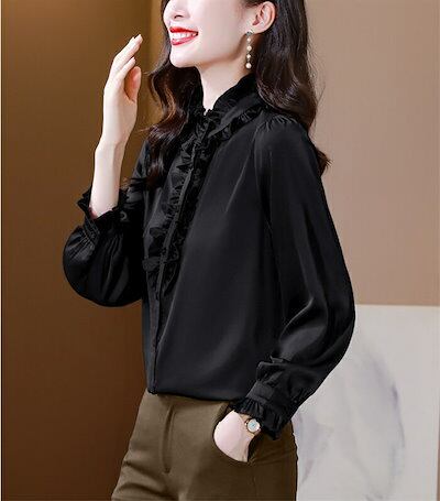 シャツ ブラウス シャツブラウス レディース 長袖 フリル襟 前開き トップス 無地 フリル袖 エレガント フェミニン ゆったり シルエット 細見せ 可愛い 体型カバー 通勤OL オフィス フォーマル