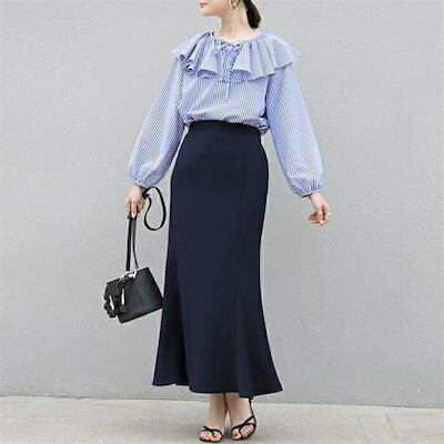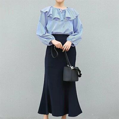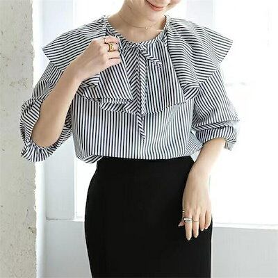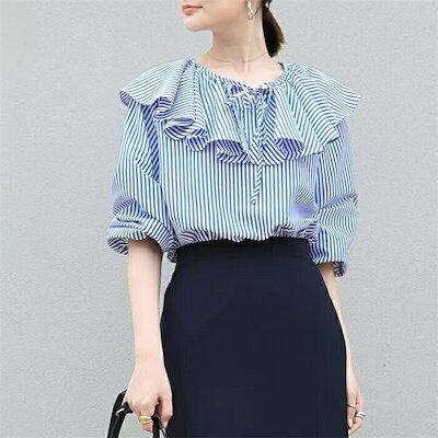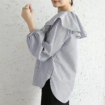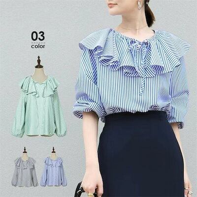 ブラウス フリル襟 シャツブラウス レディース 春秋 シャツ ストライプ柄 パフ袖 長袖 可愛い プルオーバー ボリューム袖 森ガール ガーリー クルーネック きれいめ 着?せ ゆったり 体型カバー