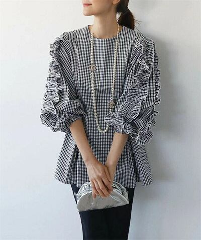 シャツ ブラウス レディース 春夏 シャツブラウス 長袖 ロングシャツ 無地 フリル ロング丈 クルーネック ギャザー オフィス トップス 無地 チェック柄 チェックシャツ ゆったり フォーマル 体型