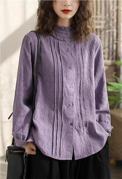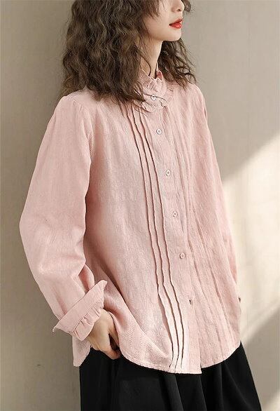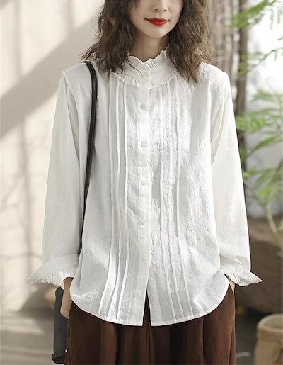 シャツ レディース 春秋 シャツブラウス 長袖 綿シャツ コットン 立ち襟 フリル襟 前開き ギャザー 無地 可愛い 白シャツ オフィス 通勤 OL トップス 体型カバー 上品 お洒落 オフィス スー