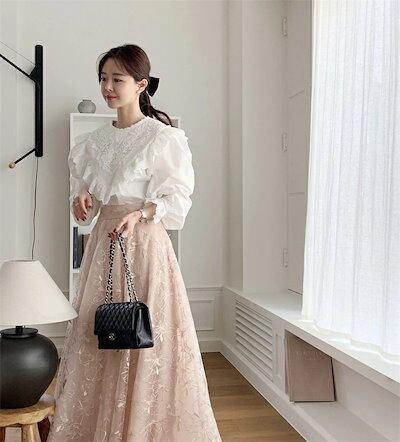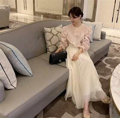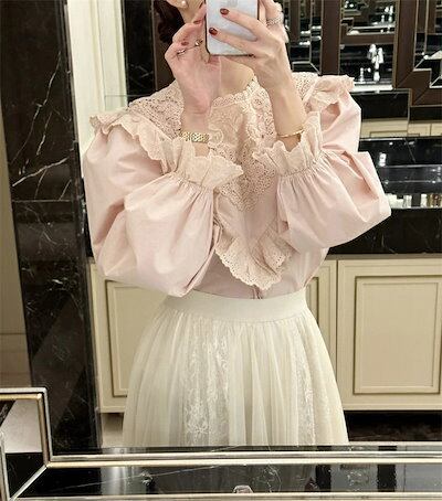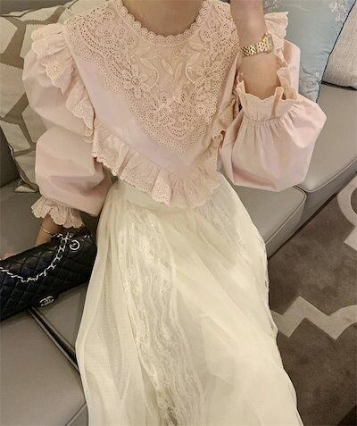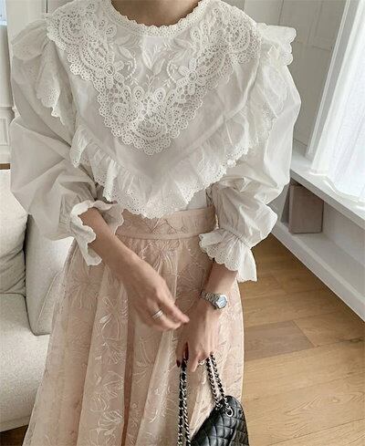 ブラウス レディース 春 シャツブラウス 切り替え 綿 フリル 可愛い コットン フレア袖 クルーネック オフィス トップス 森ガール ゆったり 着?せ カジュアル きれいめ 上品 無地 シンプル お