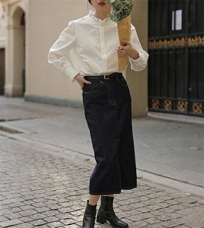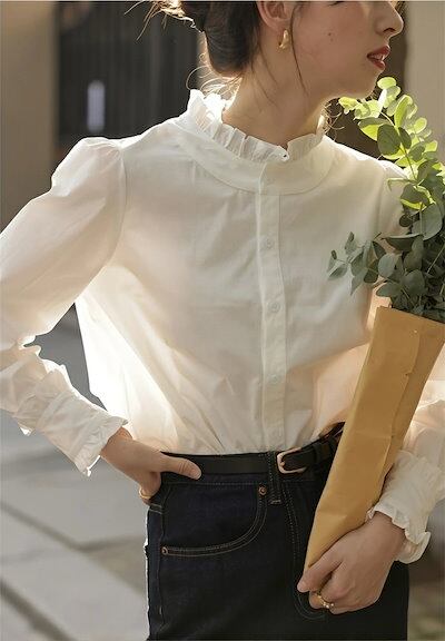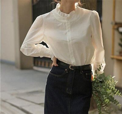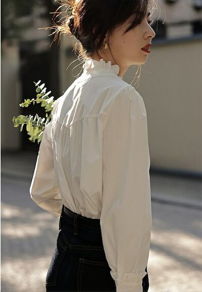 シャツ ブラウス 襟フリルシャツ レディース シャツブラウス 襟フリル 白シャツ 長袖 スーツ インナー スタンドカラー フォーマル 無地 ホワイト 白 袖フリル トップス オフィス ビジネス 立ち襟