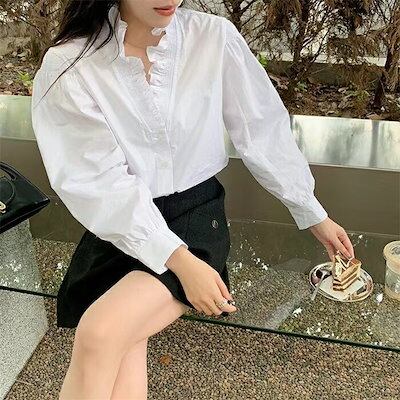 シャツブラウス シャツ レディース 白シャツ 長袖 Vネック 立ち襟 フリル襟 ブラウス パフ袖 無地 トップス 大人 ゆったり 可愛い 通勤 OL 日常着 体型カバー 上品 お洒落 オフィスインナー
