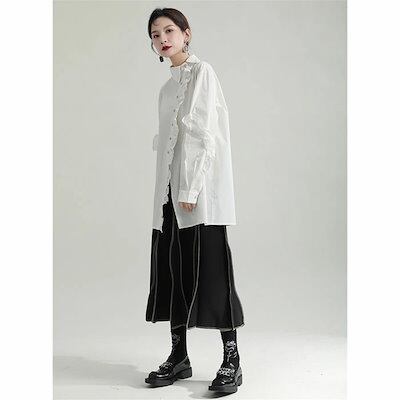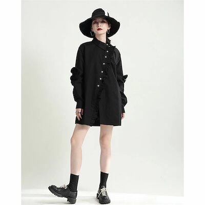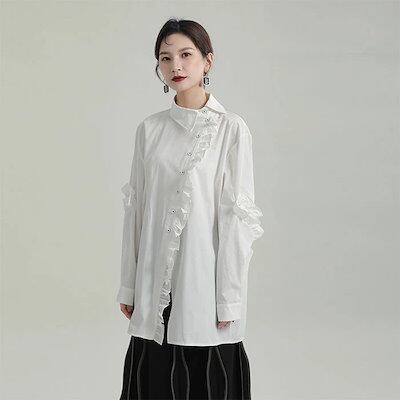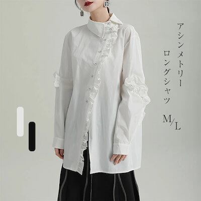 フリルブラウス シャツ ブラウス レディース トップス ロング丈 デザイン襟 長袖 斜めボタン 胸元フリル タック 無地 きれいめ モード系 変形デザイン アシンメトリーシャツ オケージョン きれいめ
