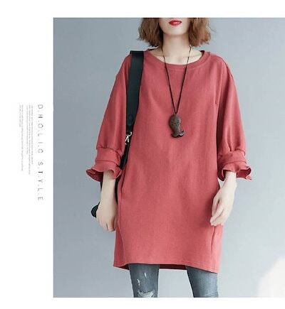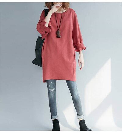 チュニック レディース 春 秋 フレア袖 フリル袖 大きいサイズ トレーナー 7分袖 ゆったり Tシャツ ロンT ブラウス オシャレ カジュアル ウエストギャザー 着回し 体型カバー ゆったり ゆるっ