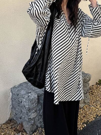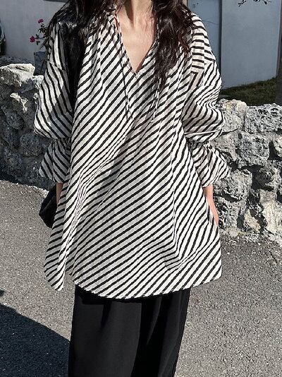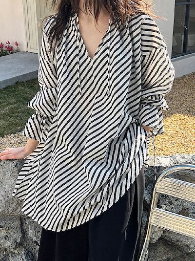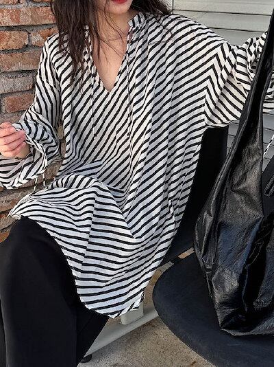 チュニック 長袖 レディース 夏 春 秋 フレア袖 フリル袖 大きいサイズ ゆったり チュニック ストライプ柄 Tシャツ ロンT ブラウス キーネック オシャレ カジュアル 着回し 体型カバー ゆった