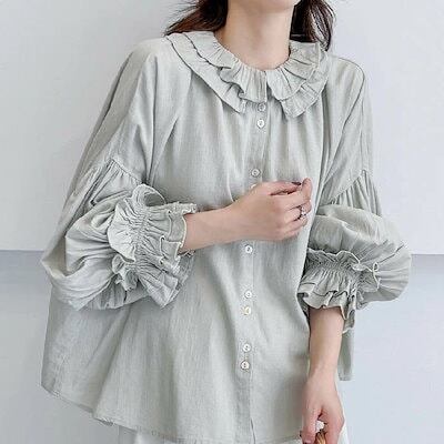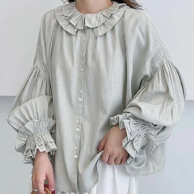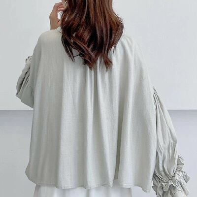 シャツ レディース 綿麻 ブラウス シャツ 長袖 ボリューム袖 トップス とろみシャツ ビックカラー リネン コットン きれいめ おしゃれ 春 秋 シャツ フリル袖 フェミニン 着回し 体型カバー ゆ