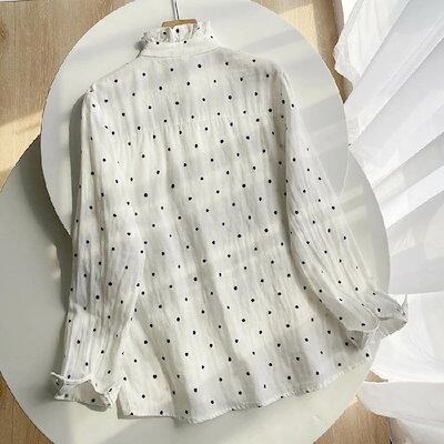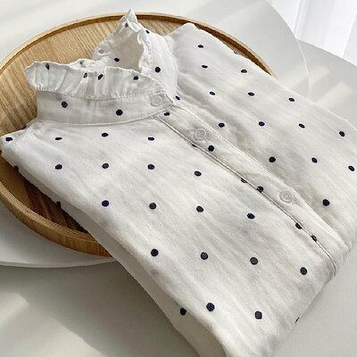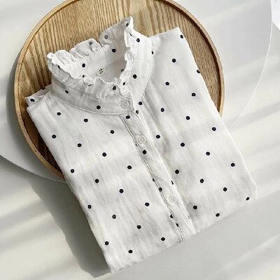 シャツ ブラウス レディース フリル襟 シャツ ガーゼ ドット柄 ハート柄 綿 コットン ブラウス 長袖 トップス 羽織り カジュアル 無地 ブラウス 大きいサイズ 体型カバー ゆったり 通勤 春 秋