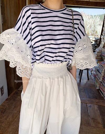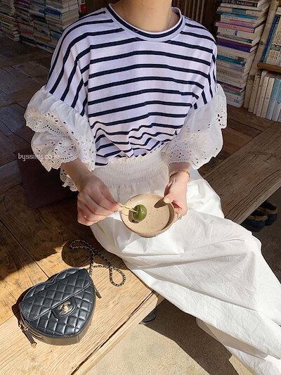 Tシャツ レディース 半袖 ブラウス フリル袖 レース切り替え ボーダー柄 無地 ボリューム袖 春 秋 夏 トップス 五分袖 ゆったり オシャレ 韓国風 大人 カジュアル 体型カバー 20代 30代