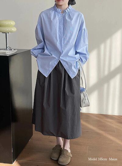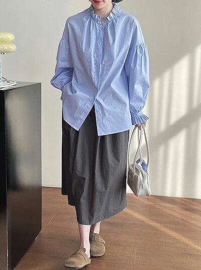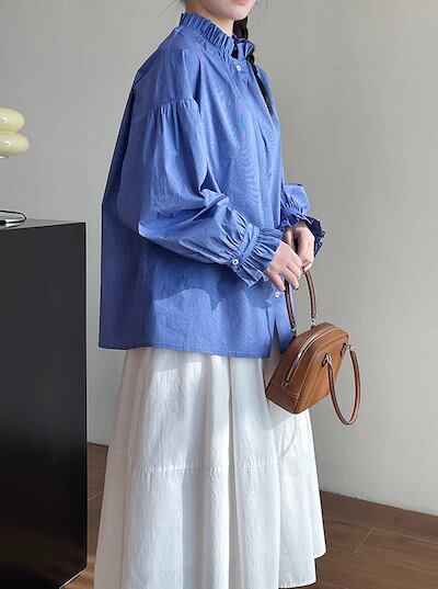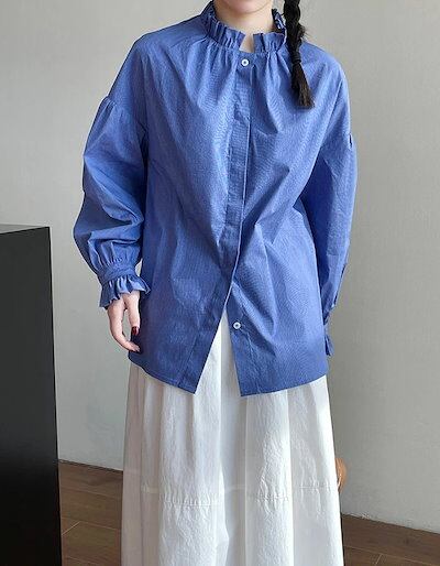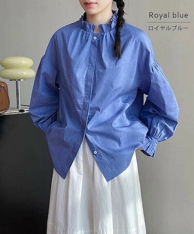 ブラウス 長袖 おしゃれ シャツ レディース トップス 羽織り フリル 大人可愛い かわいい 襟 立ち襟 スタンドカラー カジュアル ボリューム袖 バルーンスリーブ パフスリーブ 上品 きれいめ 大き