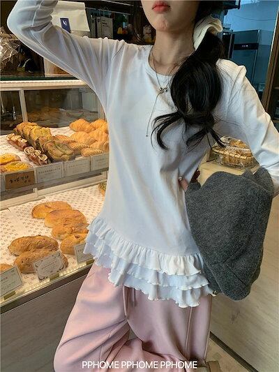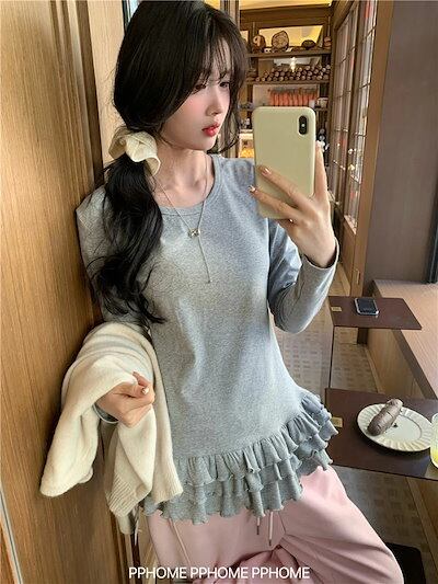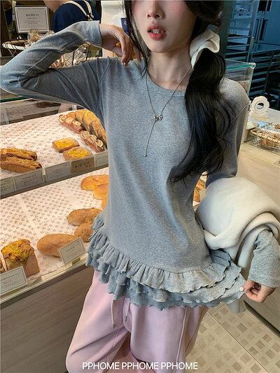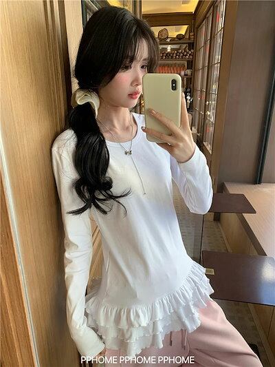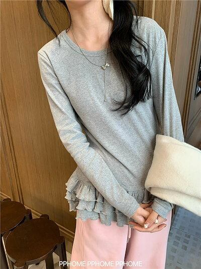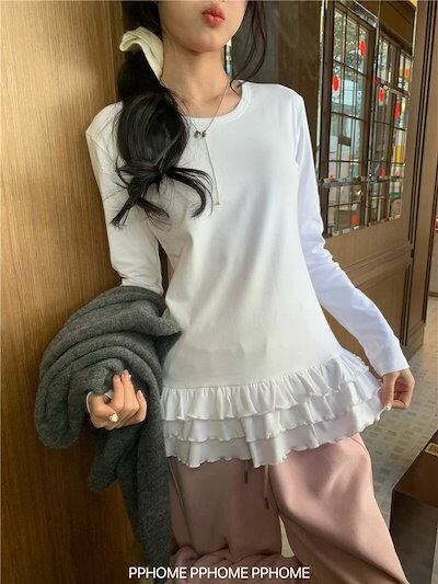 ティアード カットソー レディース 長袖tシャツ 春秋 裾フレア インナー トップス 無地 切り替え ロングt フリル レイヤード 体型カバー おしゃれ 大人可愛い 体型カバー 着痩せ 楽ちん 着回し