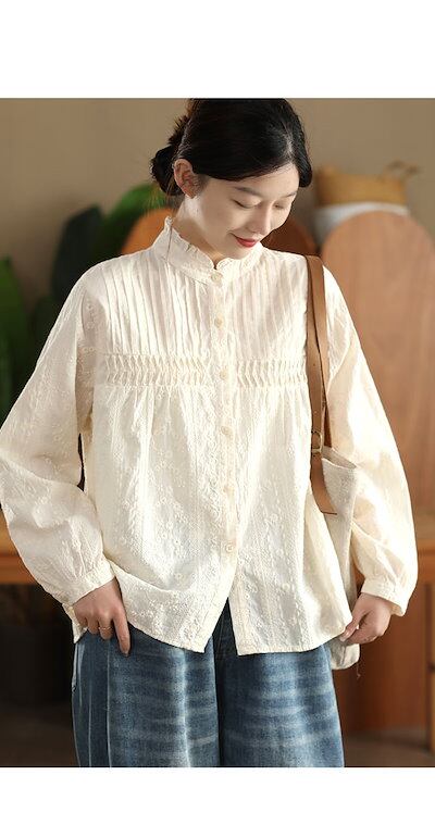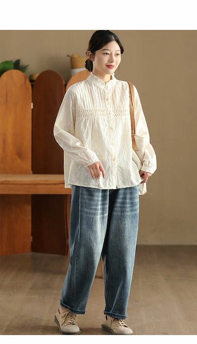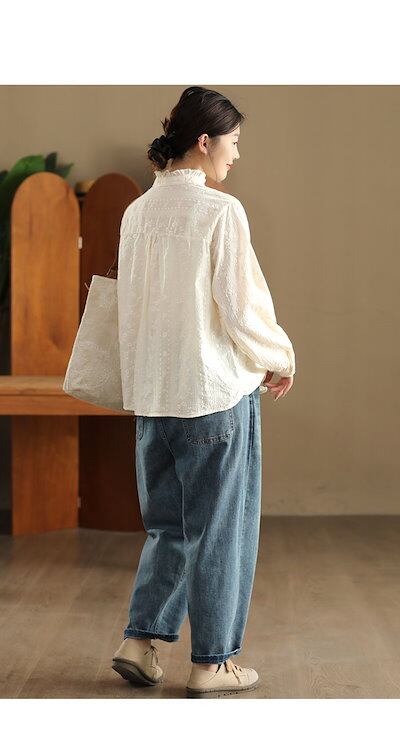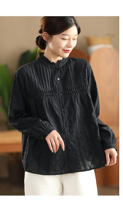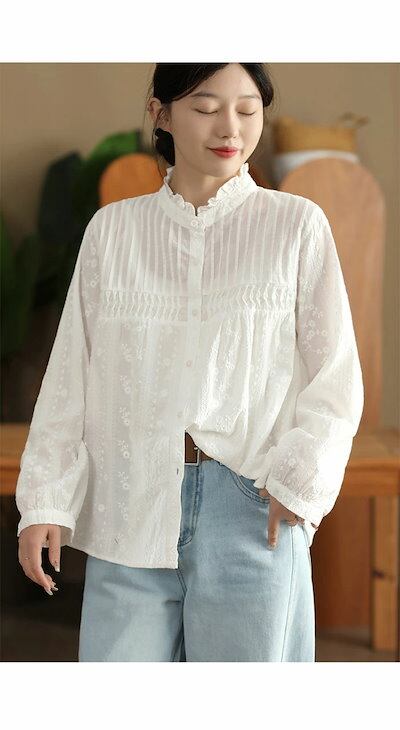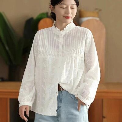 フリル襟 シャツ ブラウス レディース 長袖 立ち襟 刺繍 コットン 綿 シャツ スタンダードカラー シャツブラウス 大きいサイズ 前開き トップス ゆったり カジュアル キレイめ ナチュラル 大人可
