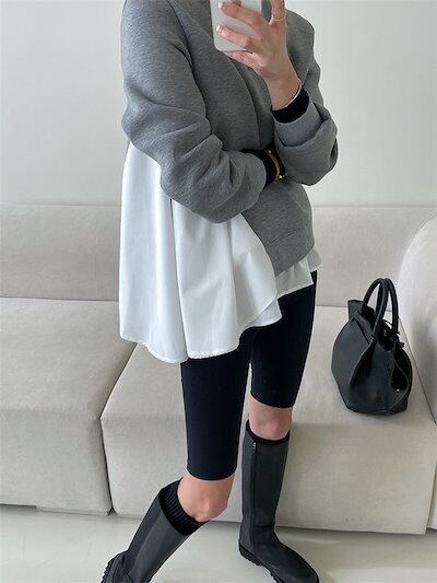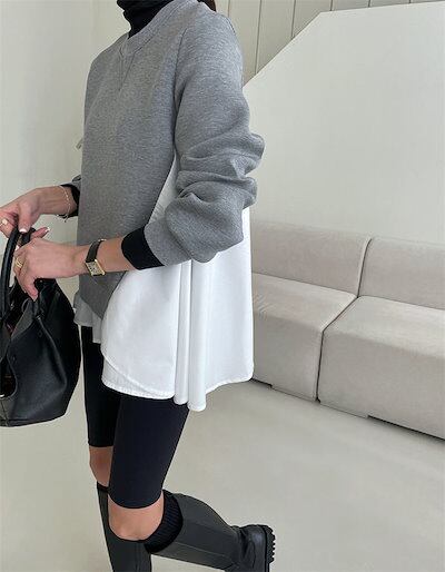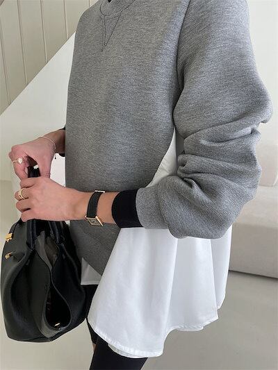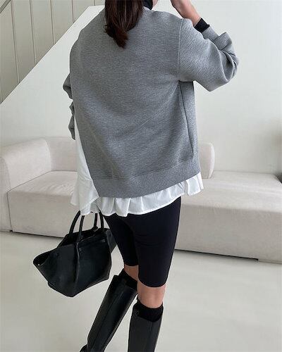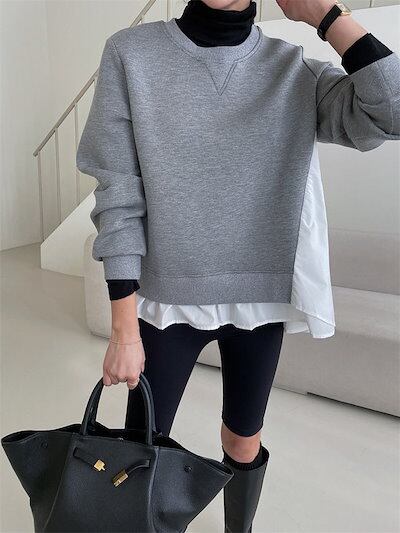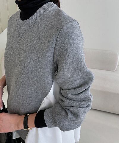 トレーナー カットソー 長袖 レディース スウェット スエット ダンボール トップス 裾フリル フレア 大きいサイズ Aライン 大きいサイズ 切り替え 異素材 ドッキング tシャツ パーカー クールネ