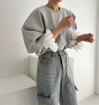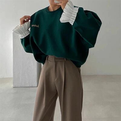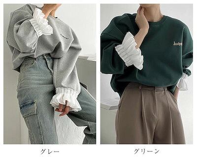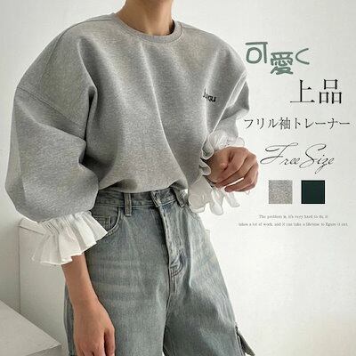 フリル袖トレーナー レディース 春 秋 長袖 トップス スウェット トレーナー 異素材切り替え フリル袖 無地 シンプル ゆったり カジュアル ボリューム袖 大きいサイズ ゆるっと 重ね着風 着?せ