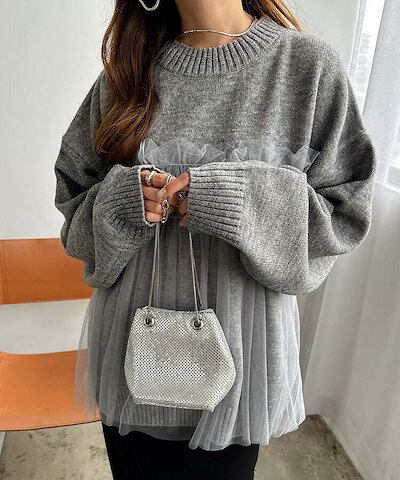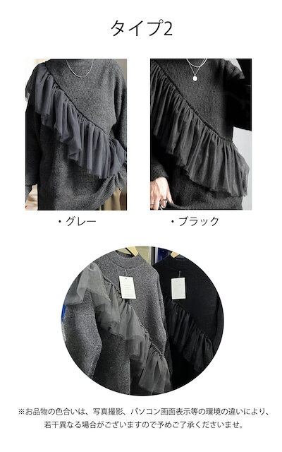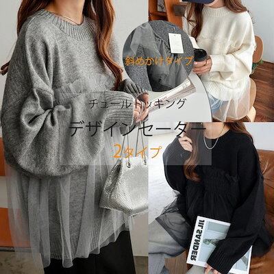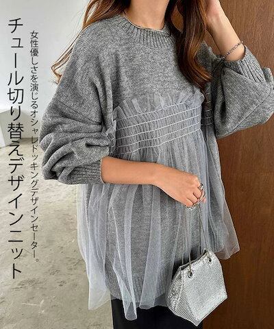 チュール ドッキング ビスチェ風 ニット トップス レディース ニットトップス セーター プルオーバー 長袖 フリル アシメ オーバーサイズ 体型カバー チュニック 着映え トレンド カジュアル きれ