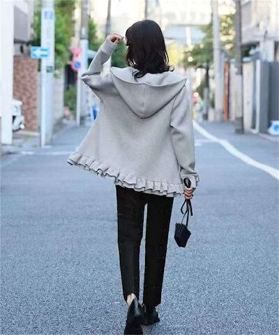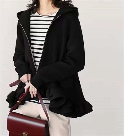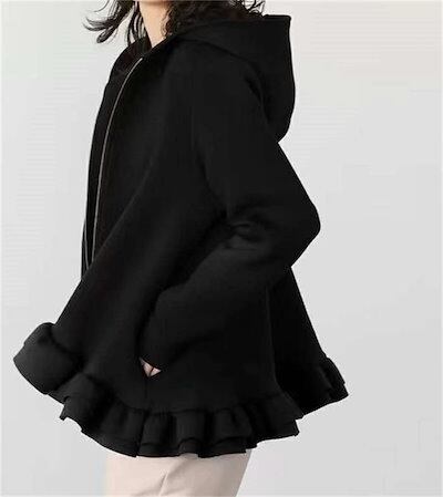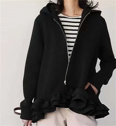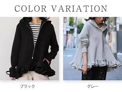 ジップアップパーカー フリルパーカー パーカー レディース 長袖 トップス 秋 冬 ジップアップ フレアパーカー 無地 大きいサイズ きれいめ フード付き アウター ブルゾン ジャケット 黒 フレア