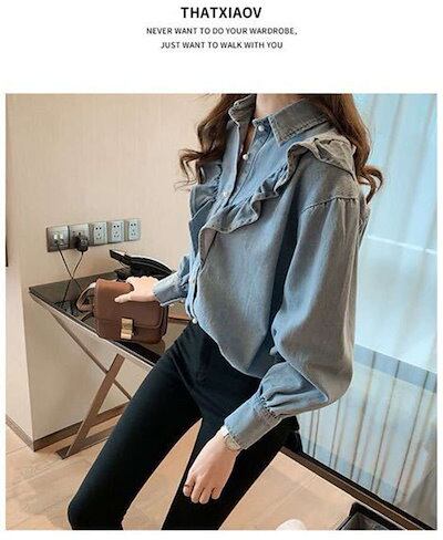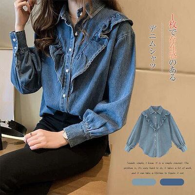 デニム シャツ ブラウス 春 秋 冬 レディース きれいめ 上品 長袖 ブラウス デニムシャツ トップス シャツ デニム フリル 大人可愛い フレア 韓国風 大きいサイズ カジュアル おでかけ 着まわ