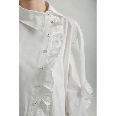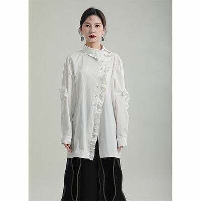 フリルシャツ ブラウス レディース トップス ロング丈 シャツ デザイン襟 長袖 斜めボタン 胸元フリル タック 無地 きれいめ モード系 変形デザイン アシンメトリー シャツ オケージョン きれいめ