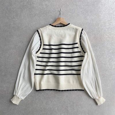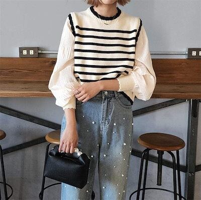 ニット ドッキング トップス プルオーバー レディース セーター 長袖 ボリュームスリーブ モックネック 立ち襟 ネックフリル ブラウス バルーン ぽわん袖 シフォンスリーブ ギャザー 異素材 リブニ