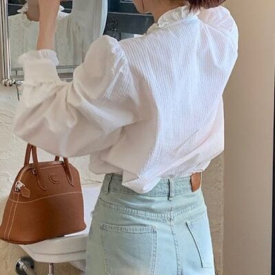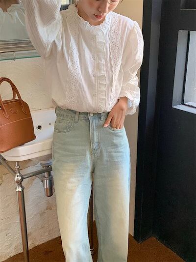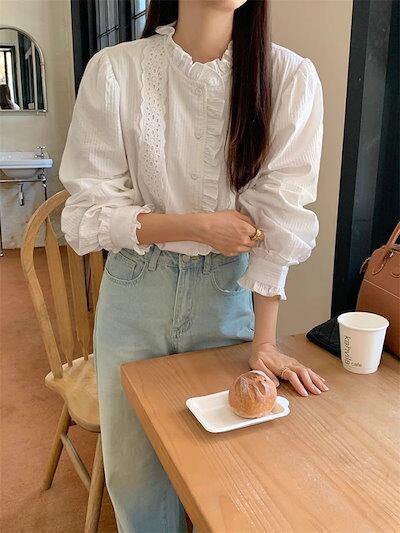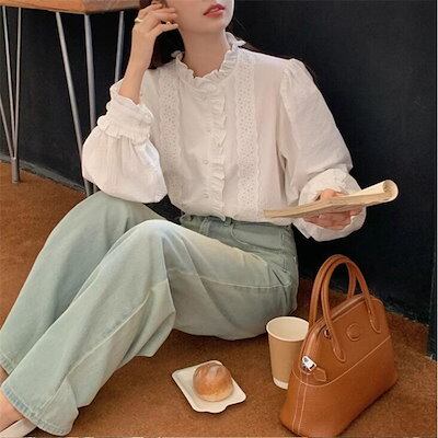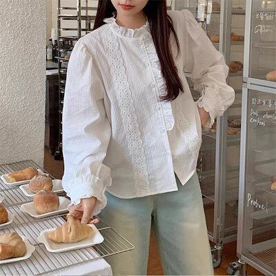 ブラウス レディース 長袖 シャツブラウス 襟フリル シャツ レース 白ブラウス 綿混 トップス 無地 前開き スーツインナー お洒落 可愛い カジュアル オフィス 無地 シンプル ゆったり 定番 エ