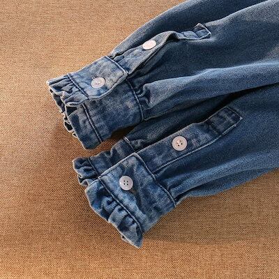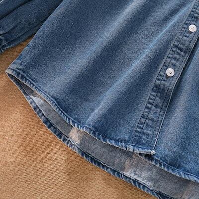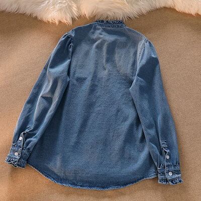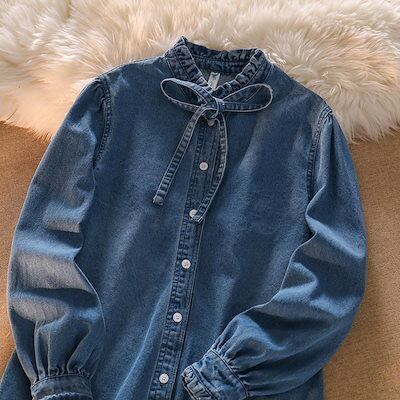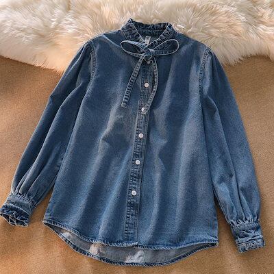 夏の準備!ブラウス レディース トップス シャツ デニム 立ち襟 フリル リボン ボウタイ 長袖 春 春服
