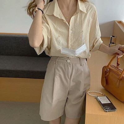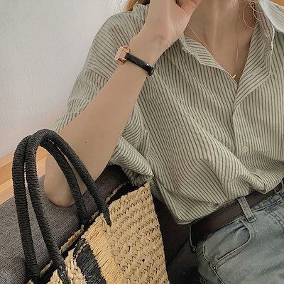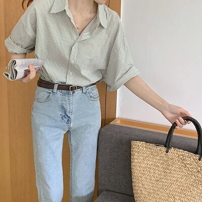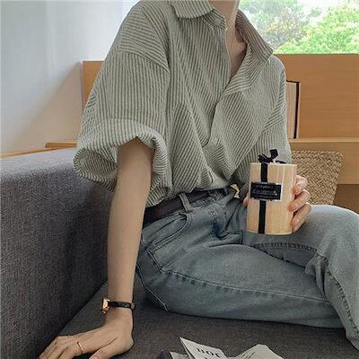 ストライプ 半袖 シャツ レディース 夏 デザイン デザイン ニッチ 薄手 シック 香港風 エイジ ダウン ポロカラー シャツ トップ 潮 シャツ 半袖 レディース