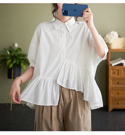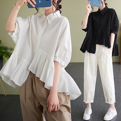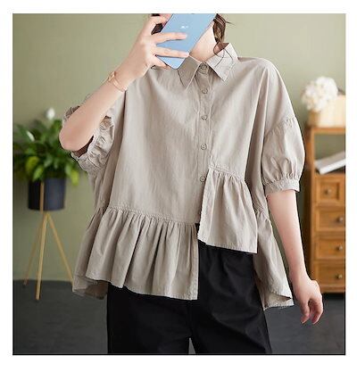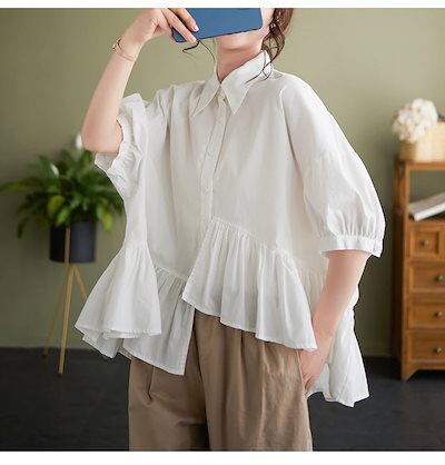でもブラウス シャツ レディースシワ半袖シャツ可愛いスウィートで無地トップス着痩せ大きいサイズ不規則韓国キャンパス風ファットマミー長袖ブラウス シャツ レディース