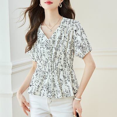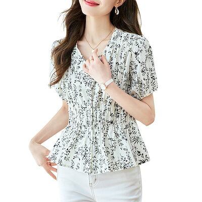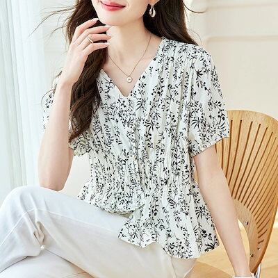 今っぽシアーシャツ 韓国 フランスVネックコットン花柄半袖シャツ夏の新作ゆったり上品トップス ブラウス レディースファッション オフィス カーディガン