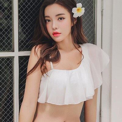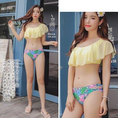 水着セット ビキニ水着レディース花柄フリルトップスワンショルダー花柄ビキニビーチプールパット付