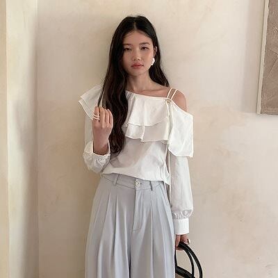 エフワンFONE 建河 2025 春夏 フレンチフリルニッチホワイトシャツ レディース ウエスタンスタイル ワンショルダートップ 29036